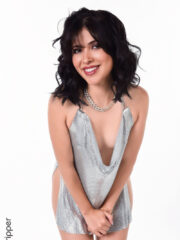 Watch as naughty teen Annie Hill teases with her intimate striptease, shedding her silver dress to reveal her bare, braless breasts and smooth, bald slit in this sensual solo show.