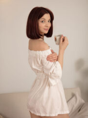 Gorgeous brunette Hannah Everly strips bare, releasing a tantalizing white mini dress to reveal her firm natural tits and perfectly shaved pussy. Feast your eyes on her sensual nude poses as she admires her sexy, toned body.