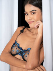 Stunning brunette Cookie, strips seductively, unveiling her sexy figure in a revealing blue sheer lingerie ensemble. Watch as she bares her full natural breasts and exposes her bare, smooth pussy in an intimate, arousing display.